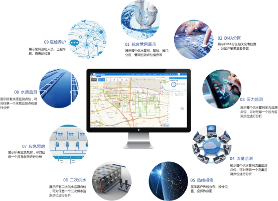 水务一体化管理对信息整合共享,有效支撑基础管理和公共服务提出了新的需求。按照“ 顶层设计、统一标准、资源整合、系统集成、共建共享、分级维护 ” 等原则,构建基于水务“一张图”的管理体系能够最大化提升水务核心数据库的利用率,实现对管网的压力、流量、水质、二次供水、DMA等供水设施的一体化全过程决策分析和实时监管,实现以信息化带动管理精细化,展示管网线路以及各个监测设备的空间分布,实现管网基础数据的查看功能,将管网数据以可视化的方式进行标准化、科学化和智能化管理。